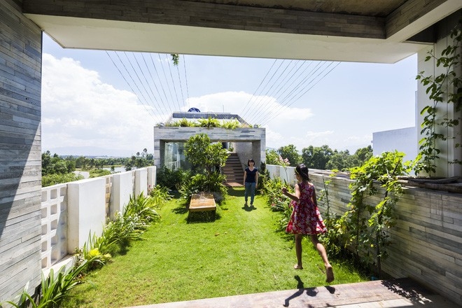 Quay lại với khu vườn trên sân thượng. Có thể nói nó giống như một công viên thu nhỏ với lũ trẻ với cỏ mát lịm dưới chân, rất nhiều cây, hoa thơm và cả rau sạch tự trồng. Thêm vào đó, ở đây cũng được thiết kế khu nướng BBQ cho những bữa tiệc ngoại trời của cả gia đình. Với tất cả những công năng một khu vườn chạy nhảy thoải mái cho lũ trẻ, nơi thư giãn, ăn uống cho cả gia đình, khu vườn trên sân thượng này quả thực là một đầu tư đáng giá trong ngôi nhà.