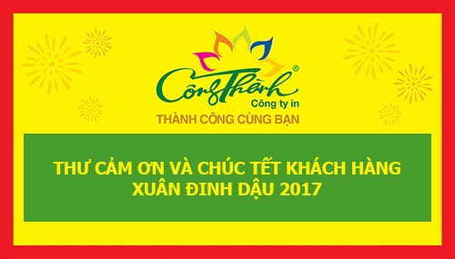 Khép lại năm 2016 với nhiều thành công rực rỡ, để có được điều đó, tất cả đều nhờ vào sự tin tưởng và niềm yêu mến của Quý Khách Hàng dành cho. Chúng tôi luôn nỗ lực gìn giữ và coi trọng mọi mối liên kết với Quý Khách hàng, bước sang năm mới 2017, Công ty in Công Thành  sẽ đầu tư thiết bị và con người chuyên nghiệp hơn nữa luôn là người bạn đồng hành cùng Quý Khách hàng phát triển trên mọi chặng đường đến thành công.